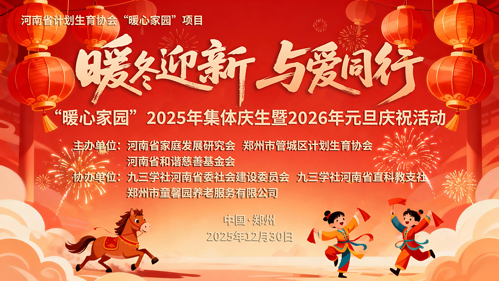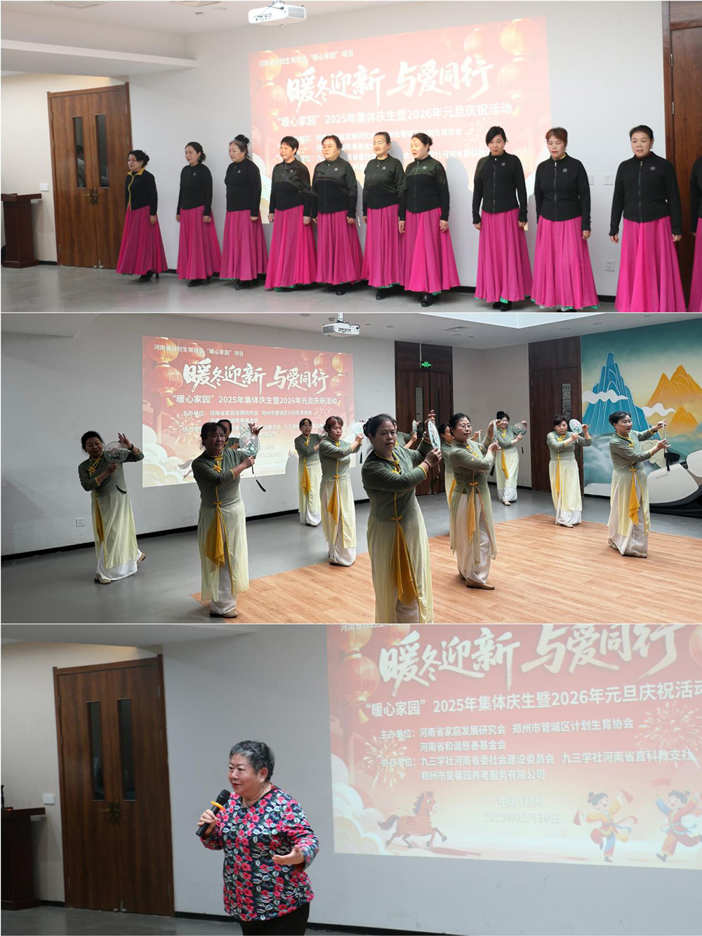 辞旧迎新添暖意,温情相伴庆生辰。2025年12月30日,由河南省家庭发展研究会、郑州市管城区计划生育协会、河南省和谐慈善基金会主办、九三学社河南省委社会建设委员会和九三学社省直科教支社、郑州童馨园养老院协办的“暖心家园”2025年下半年集体庆生暨2026年元旦庆祝活动在郑圆满举办。相关领导与项目内的计生特殊家庭老人和志愿者参加了活动。