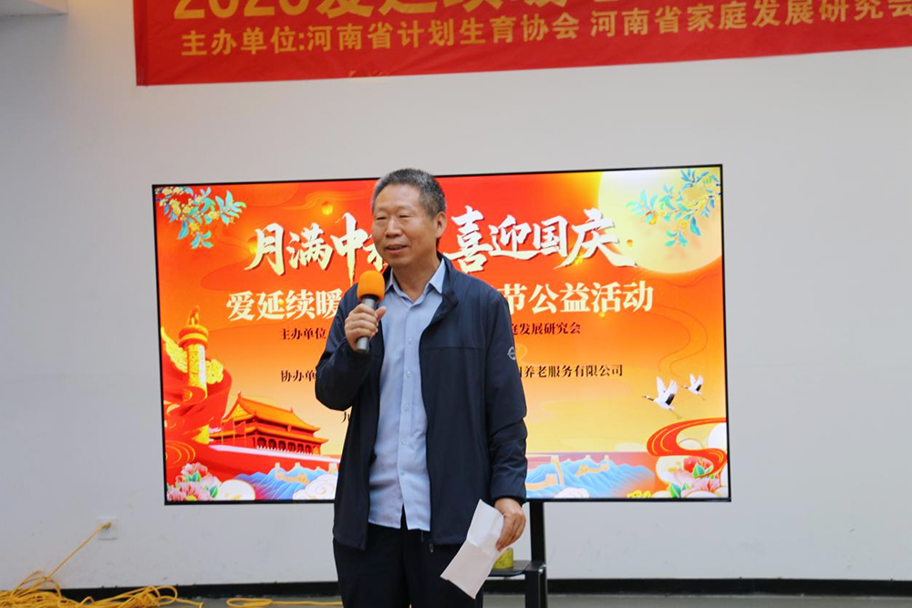 河南省卫生健康委员会原二级巡视员郎清义致辞。他首先向在场老人们致以双节祝福,并对支持计生特殊家庭关爱工作的志愿者表示感谢。他指出,"爱延续"项目已历经十余年发展,获得政府高度认可与社会广泛支持。未来将持续承接省卫健委"暖心家园"项目,开展心理疏导、健康讲座等多元化活动,丰富老人们的精神文化生活。特别是今年新启动的"健行未来"公益项目,该项目可为有康复及疼痛治疗需求的老人提供自费部分全额救助,帮助更多老人获得及时专业的医疗服务,切实提升晚年生活质量。此外,已与淮河路街道办养老服务中心合作,为计生特殊家庭提供优惠入住政策。他表示,未来将联合社会各界爱心力量,持续提升老人们的晚年生活质量,欢迎大家随时反馈需求与建议。