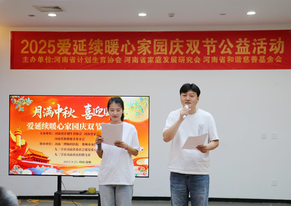 双节共欢庆团圆,金秋雅韵贺华诞。2025年9月25日上午,由河南省计划生育协会、河南省家庭发展研究会、河南省和谐慈善基金会主办、河南三博脑科医院、郑州市童馨园养老服务有限公司、九三学社河南省委社会建设委员会、九三学社河南省直科教支社协办的爱延续暖心家园庆双节公益活动在郑州举行。河南省卫生健康委员会原二级巡视员郎清义、河南省计划生育协会副秘书长范洪振、河南省和谐慈善基金会理事长、河南省家庭发展研究会副会长兼秘书长苑仁玉、河南省家庭发展研究会副秘书长、河南省和谐慈善基金会理事江国瀚、郑州市童馨园养老服务有限公司相关负责人以及河南省三博脑科医院的各位义诊专家、郑州市计生特殊家庭老人们和多名志愿者齐聚一堂,共同见证这一温暖时刻。